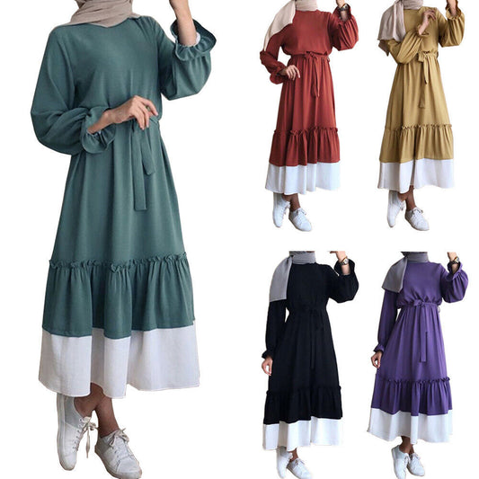 Color-blocked Fungus-trimmed Waist-cinching Lace-up Dress