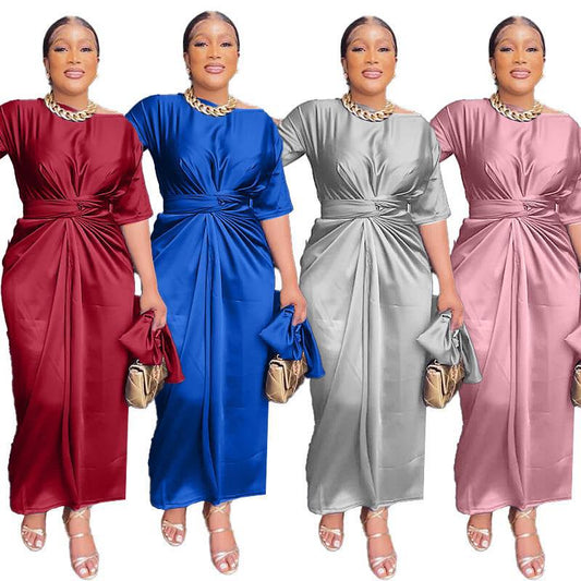 Women's Short Sleeve Waistband Tie Long Dress Two Piece Sets
