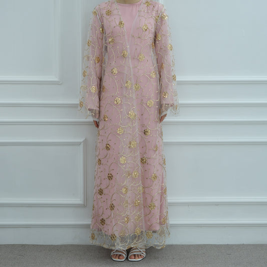 Gold Embroidered Lace Open Dress Elegant Evening Abaya