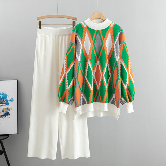 Jacquard Loose-fitting Knit Top and Wide-leg Trousers Two-piece Sets