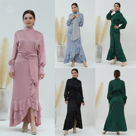 Plain High-neck Pleated Slim Ruffle Tops and Dress Matching Sets