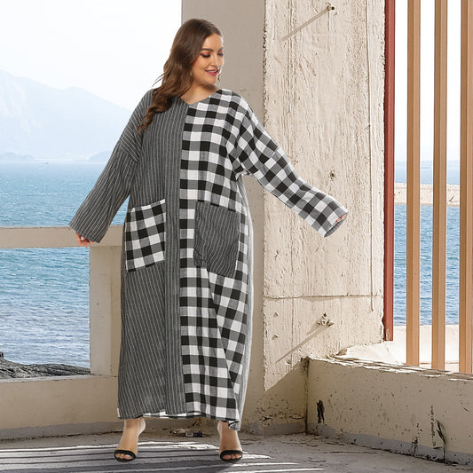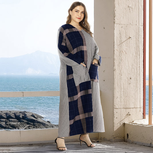 Women's V-neck Striped Geometric Panels Long-sleeved Dress