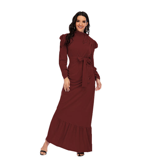 Plain Stand Collar Satin Puff Sleeve Dress