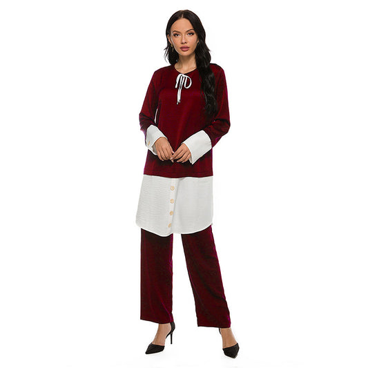 Women's Lace-Up Patchwork Tops and Wide Leg Pants Matching Sets