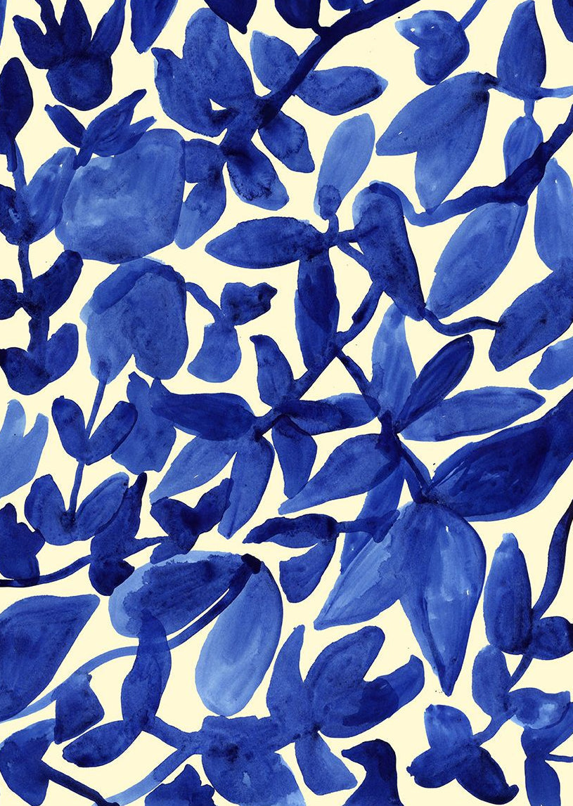 • Design: Oversized abstract blue leaves in a watercolor style