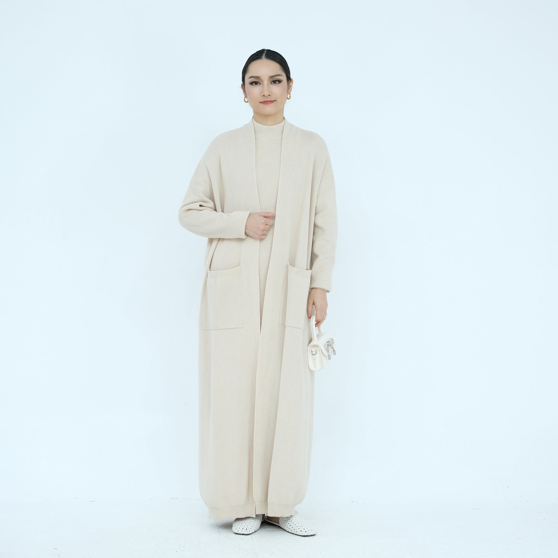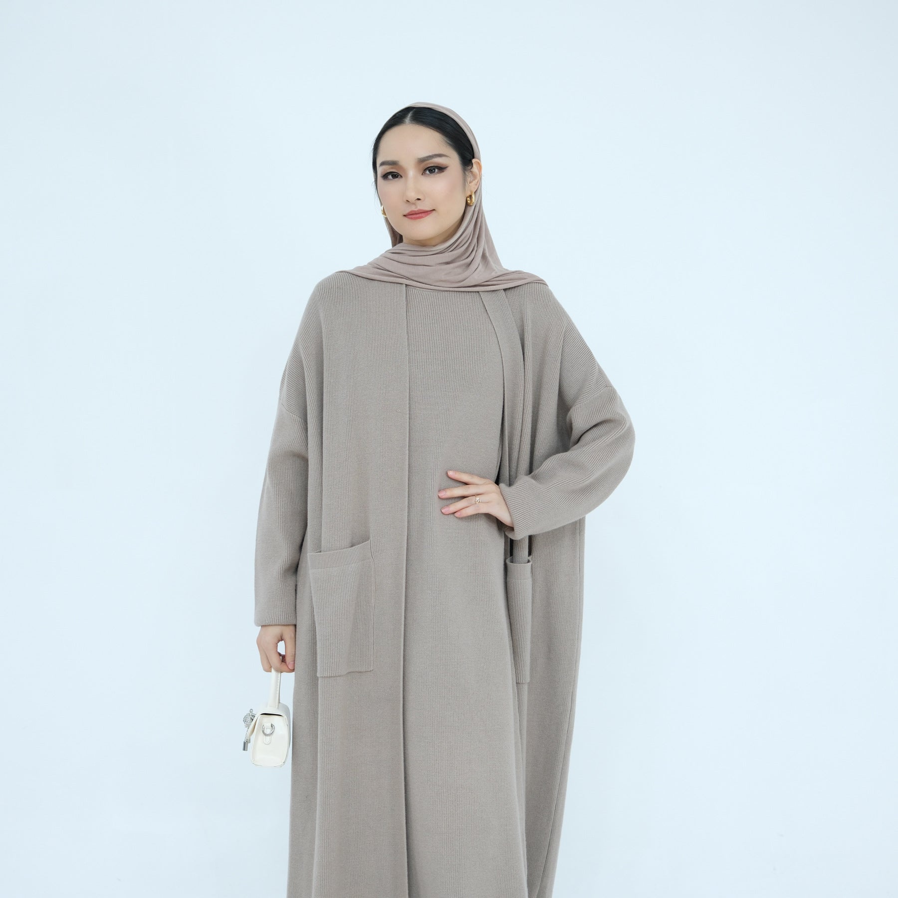 Thick Knit Two-Piece Abaya Set with Cardigan and Inner Dress