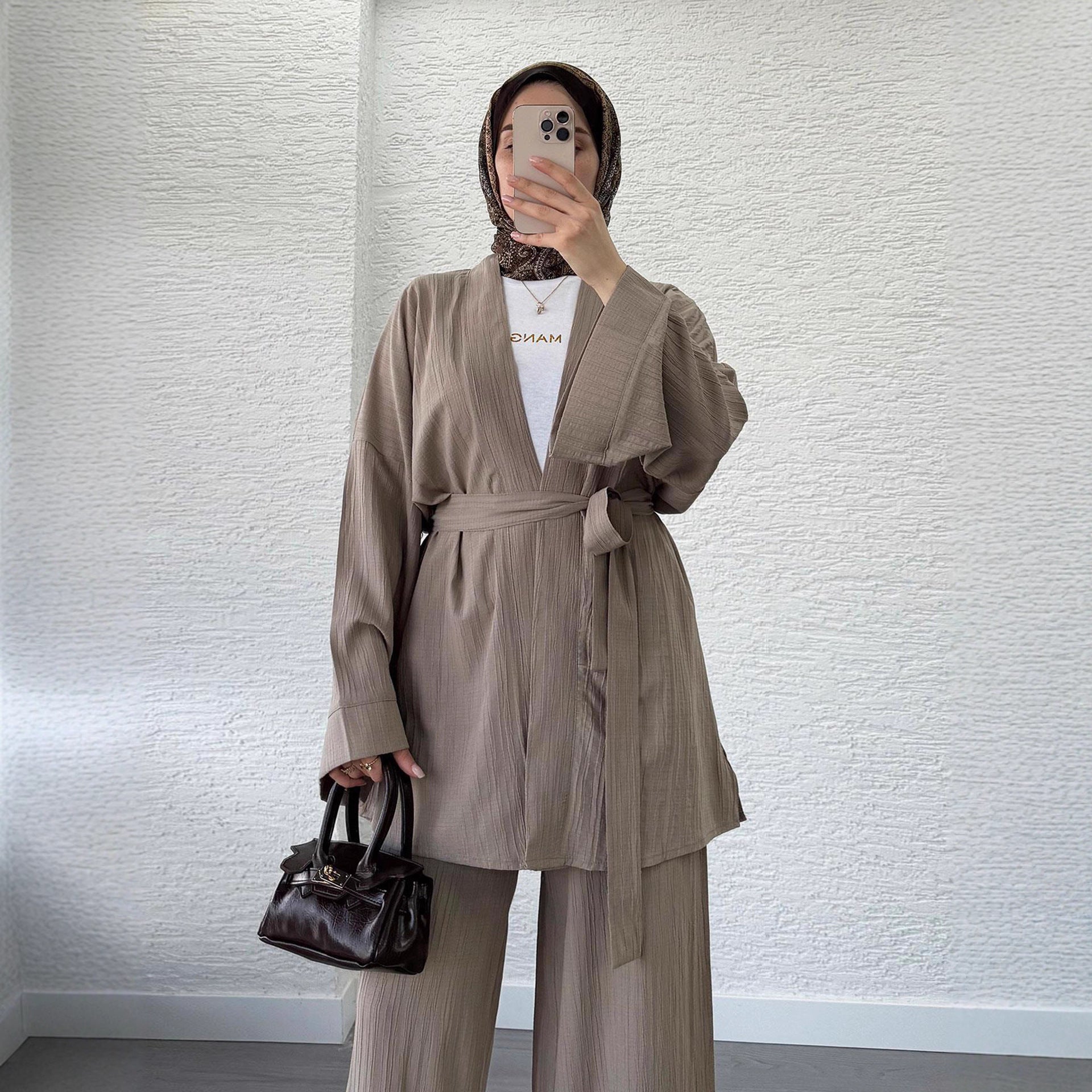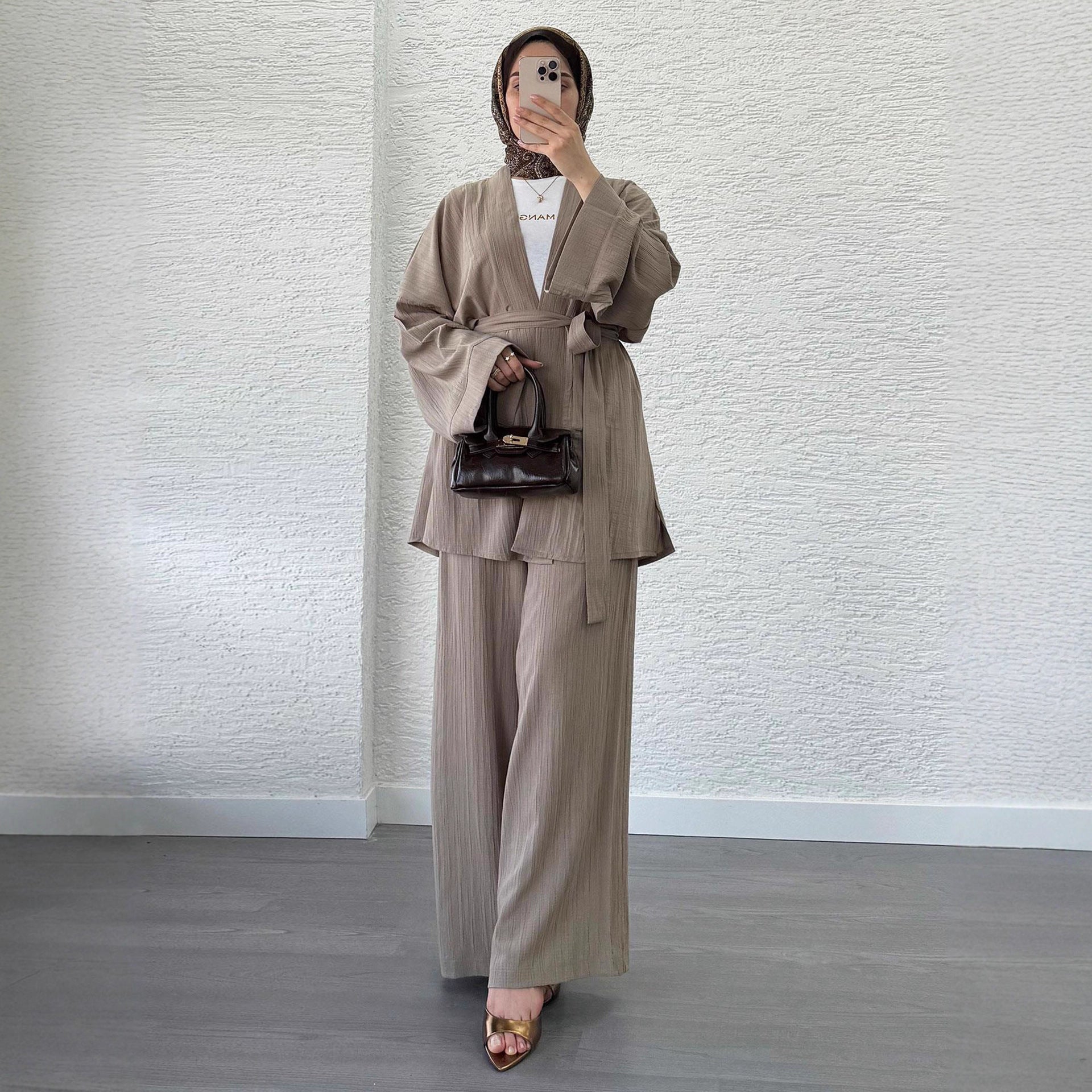 A modern two-piece outfit designed for comfortable, modest wear. This set includes a relaxed open-front long-sleeve top paired with wide-leg trousers, creating a clean and elegant silhouette suitable for daily wear, travel, and casual outings. Made from a soft knitted blended fabric, it offers breathable comfort, drape, and style for Middle Eastern and global markets.